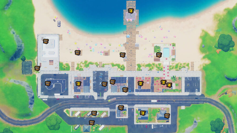 - Rechercher 7 coffres à Sweaty Sands