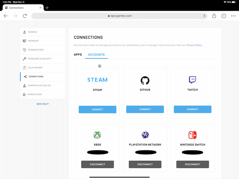 Pour connecter vos consoles, accédez aux paramètres de votre compte, situés dans le coin supérieur droit après avoir survolé votre nom d'utilisateur Epic Games. Dans les paramètres du compte, cliquez sur Connexions. Dans Connexions, cliquez sur l'onglet Comptes, situé à droite des applications.