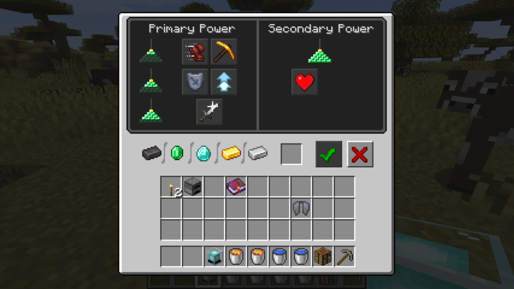 Pour activer les buffs de statut, placez un lingot dans l'espace vide, sélectionnez vos buffs et cliquez sur la coche verte. Vos buffs de statut seront désormais actifs et vous avez utilisé avec succès la balise!
