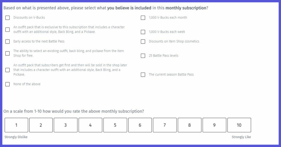 Epic enverra parfois des sondages pour recueillir des opinions sur l'état actuel du jeu et d'éventuelles mises à jour futures. Un autre de ces sondages a été envoyé récemment et contenait une question intéressante. Cette question était "En fonction de ce qui est présenté ci-dessus, veuillez sélectionner ce que vous pensez être inclus dans cet abonnement mensuel?" L'image ci-dessus est ce qui a été montré, il est donc clair qu'Epic essayait de déterminer si la publicité de l'accord potentiel était suffisamment pertinente pour que les gens le comprennent. Voici un aperçu des annonces qui ont été affichées, ainsi que la possibilité de noter l'abonnement: