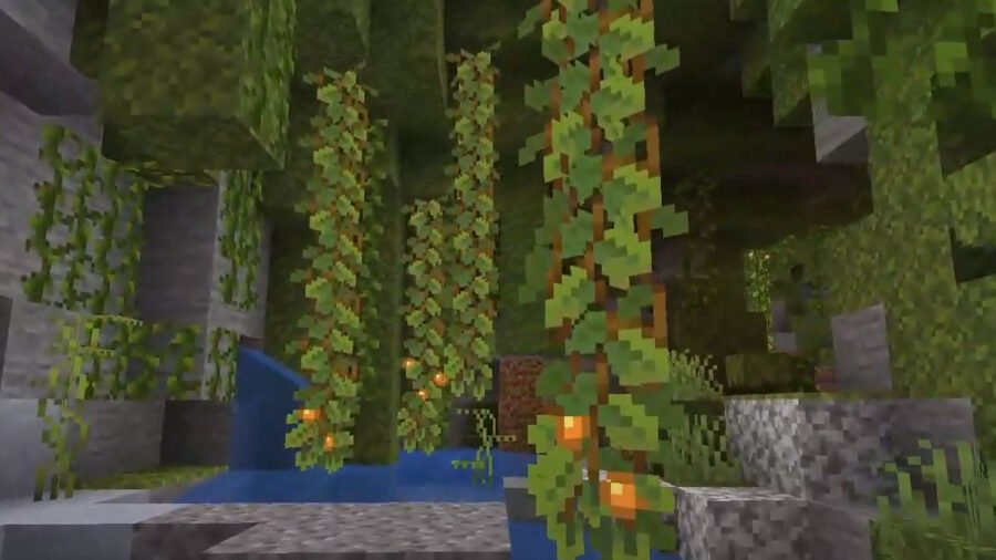 Un nouveau biome que vous pouvez vous attendre à voir s'appelle Lush Caves. Cela comprend un tas de végétation et de vignes suspendues. Vous aurez certainement l'impression d'être dans une grotte que les plantes ont envahie. Il y aura un nouvel arbre Azealia qui apparaîtra dans le monde extérieur, cela signifiera au joueur qu'il existe un biome de la grotte luxuriante si vous regardez ci-dessous où se trouve l'arbre!