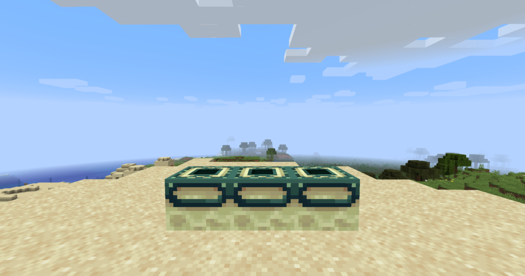 Le portail de fin est essentiellement un anneau avec 3 blocs de chaque côté. Vous devriez être en mesure de construire le portail tout en restant sur place, tout en tournant pour construire les 4 côtés. Pour commencer, placez 3 cadres de portail d'extrémité côte à côte, comme sur l'image ci-dessus.