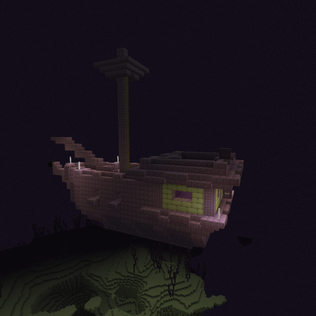 Lorsque vous atteignez le sommet, vous devez toujours vous frayer un chemin vers le navire flottant car il n'est pas connecté à la ville finale. Au lieu de cela, il flotte! Alors, très soigneusement, construisez-vous un pont en utilisant End Stone, Cobblestone ou tout ce que vous avez emporté. Maintenez Shift pendant que vous construisez, de sorte que vous soyez verrouillé sur le bloc et vous empêcher de tomber à votre mort.