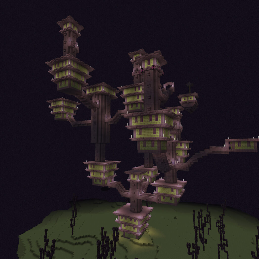 Une fois dans le plus grand Biome End, vous rechercherez une End City. Essentiellement, cela ressemble à une grande tour avec un navire flottant. Voir l'image ci-dessus. Le navire flottant est votre objectif final, car c'est là que réside l'Elytra.