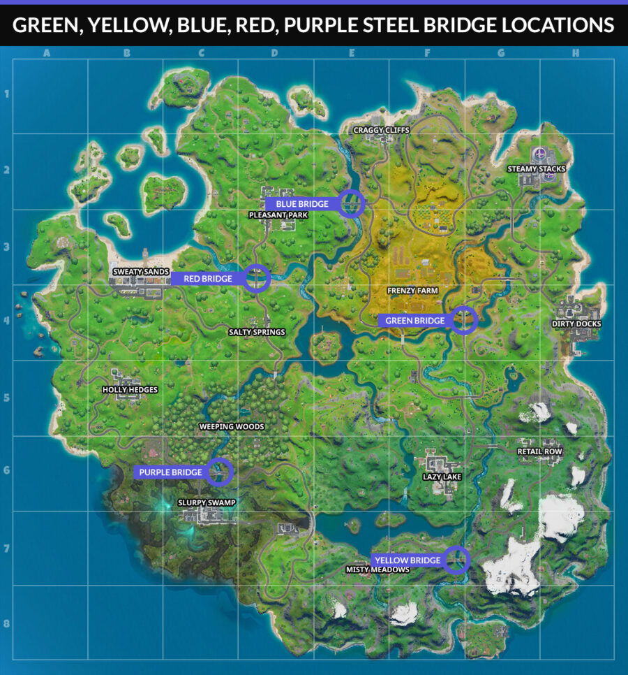 La plupart d'entre eux sont assez faciles à remplir et sont assez explicites. Le seul qui pourrait vous faire une pause est la danse sur cinq ponts colorés en un seul match. Ces ponts existent depuis la première saison du nouveau chapitre. Vous pouvez trouver tous les ponts avec la carte ci-dessous! Je me rends compte que c'est d'une saison antérieure, mais les emplacements sont à peu près les mêmes. De plus, cela peut vous donner un peu de nostalgie pour les premiers jours du chapitre!