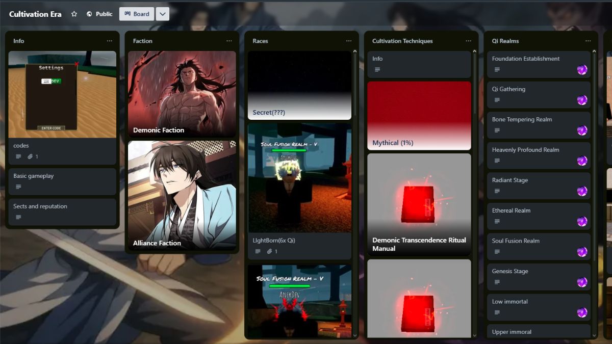 Le tableau Trello de l'ère de la culture contient des informations utiles concernant le jeu qui aidera les joueurs nouveaux et vétérans. Que vous recherchiez quoi faire lorsque vous commencez le jeu ou que vous souhaitiez en savoir plus sur des PNJ ou des factions spécifiques, l'ère de la culture Trello a tout.
