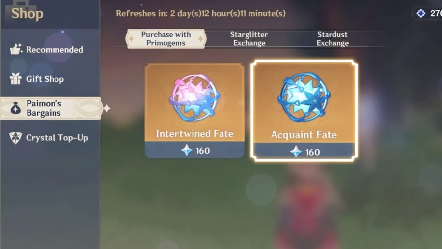 La deuxième façon consiste à échanger des Primogems. Primogem est un autre type de monnaie dans le jeu que vous obtenez plus souvent en accomplissant des quêtes, des tâches, plus ou moins tout ce que Primogem sera attribué. En utilisant le menu de la boutique, vous pouvez échanger Primogem contre les deux types de devises Wish pour la bannière que vous souhaitez utiliser. 160 Primogem = 1 devise de souhait.