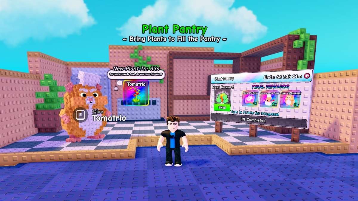 Pour commencer l’événement Plant Pantry, dirigez-vous vers l’île centrale, qui se débloque après avoir atteint Rebirth 1 et payé 1 000 000 ₵ Cash. Une fois sur place, parlez au nouveau PNJ Chef Chubbeloni, situé près du centre de l'île.