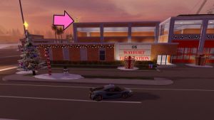 Sortez du parking et entrez dans la rue Pacifica. Descendez jusqu'à la fontaine et vous verrez l'elfe sur le rebord du bâtiment à droite. Vous pouvez l'attraper avec un hélicoptère, mais vous pouvez aussi le faire d'une manière différente.