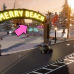Dirigez-vous vers l’autre extrémité de Marry Beach et vous verrez un panneau sur la glace. C'est glissant, alors faites attention à la dérive. Conduisez vers lui et vous verrez le panneau Santa's Shop, ainsi qu'un elfe à sa gauche.