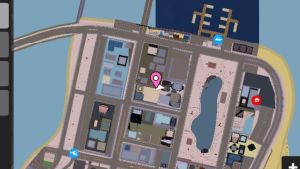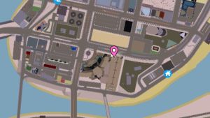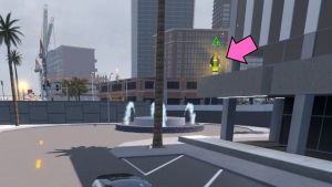 Sortez du parking et entrez dans la rue Pacifica. Descendez jusqu'à la fontaine et vous verrez l'elfe sur le rebord du bâtiment à droite. Vous pouvez l'attraper avec un hélicoptère, mais vous pouvez aussi le faire d'une manière différente.