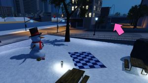 - Au bout, regardez autour du bâtiment à gauche et vous verrez un bonhomme de neige.