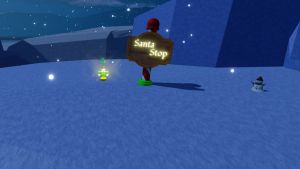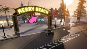Dirigez-vous vers l’autre extrémité de Marry Beach et vous verrez un panneau sur la glace. C'est glissant, alors faites attention à la dérive. Conduisez vers lui et vous verrez le panneau Santa's Shop, ainsi qu'un elfe à sa gauche.