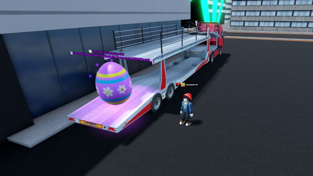 Le huitième œuf de Pâques se trouve à l’arrière d’un camion à plateau garé en face d’un bâtiment qui brille de lumières vertes vives.