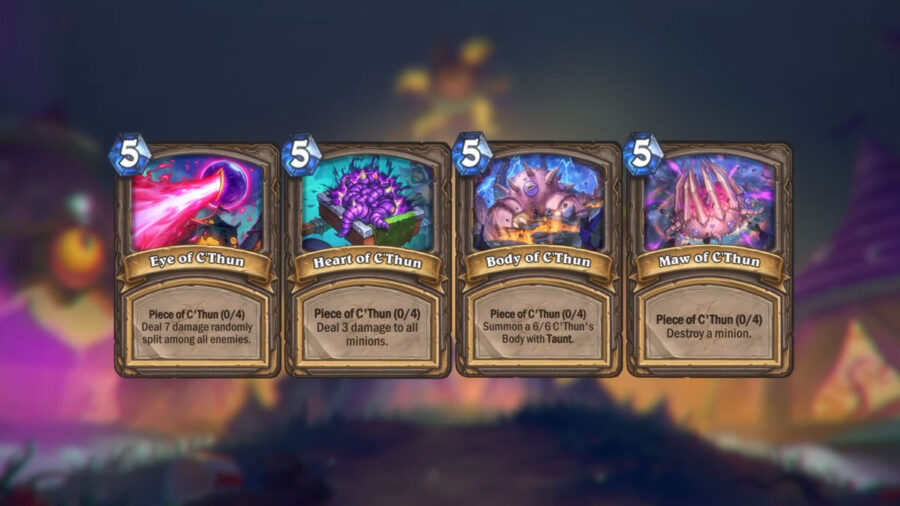 Voici les morceaux de C'Thun qui seront ajoutés à votre deck! Si vous pouvez tous les jouer, vous créerez à nouveau C'Thun qui infligera 30 dégâts répartis entre tous les ennemis!