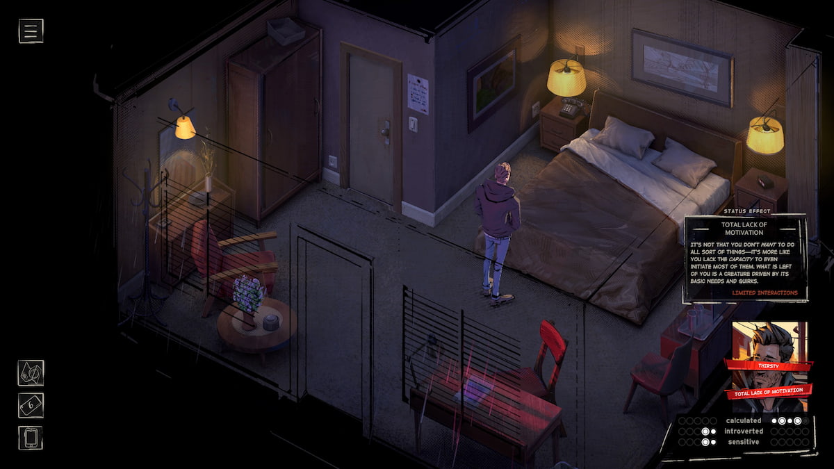 Le manque total de motivation est un effet de statut. Comme la plupart des autres à Rue Valley, cela a principalement des conséquences négatives sur vos options de dialogue. Cependant, celui-ci est particulièrement désagréable, car il limite considérablement votre capacité à interagir avec l'environnement, simplement parce que vous n'êtes pas suffisamment motivé pour le faire. Au début du jeu, par exemple, vous ne pourrez pas parler à la fille dehors qui donne un coup de pied dans le distributeur automatique, ni même déballer vos affaires.